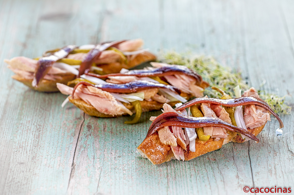 Y como, pues como he dicho al principio, dejando que el protagonista sea el producto, «estropeándolo» lo menos posible. Un canapé que a mi me apasiona. Bonito, piparrak, cebolleta y anchoa. Mmmm…