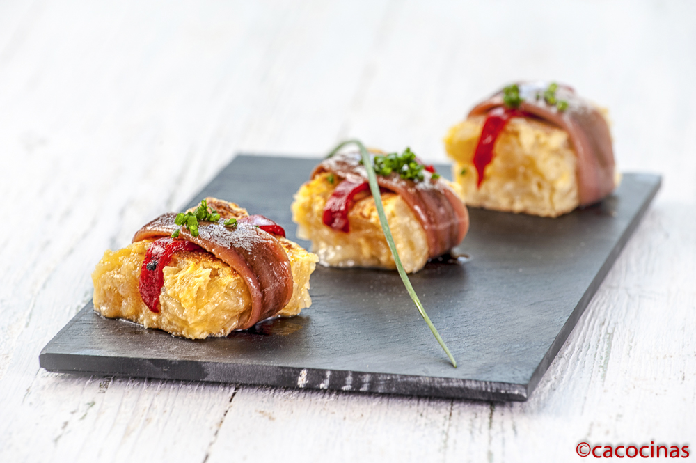 Un espectáculo de anchoa… Este plato me llevaba tiempo rondando la cabeza. Un día, en el país vasco, oí la tortilla de anchoa. Nada que ver con lo que os presento, pero a mí me vino esto a la cabeza: una especie de bombón de tortilla y anchoa. Tortilla poco cuajada, con bastante cebolla y subida de yema, que se te deshaga en la boca. Con el sabor brutal y delicado de esta anchoa y un toque de pimiento de piquillo asado.