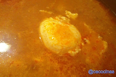 Ahora dos opciones. Mi madre separa así del fuego, casca un huevo encima por persona y deja que se cuaje ya fuera del fuego. Yo, como mi mujer es muy «tiquismiquis» doy un varillazo para que el pan se deshaga y luego sigo el proceso de mi madre, casco el huevo y dejo que se cuaje. Y….. A disfrutar….